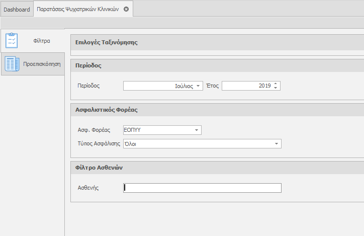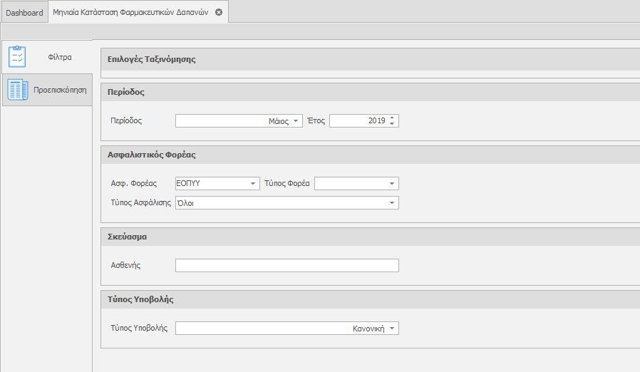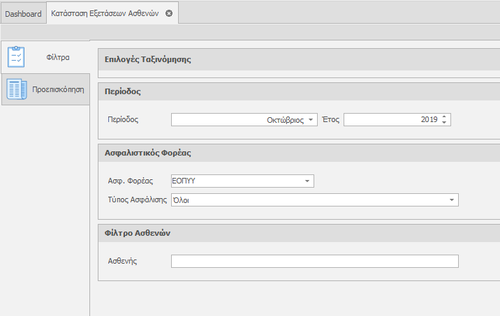 Επιλέγουμε την Περίοδο, το Φορέα και τον Τύπο Ασφάλισης που επιθυμούμε και κλικάρουμε την καρτέλα Προεπισκόπηση.