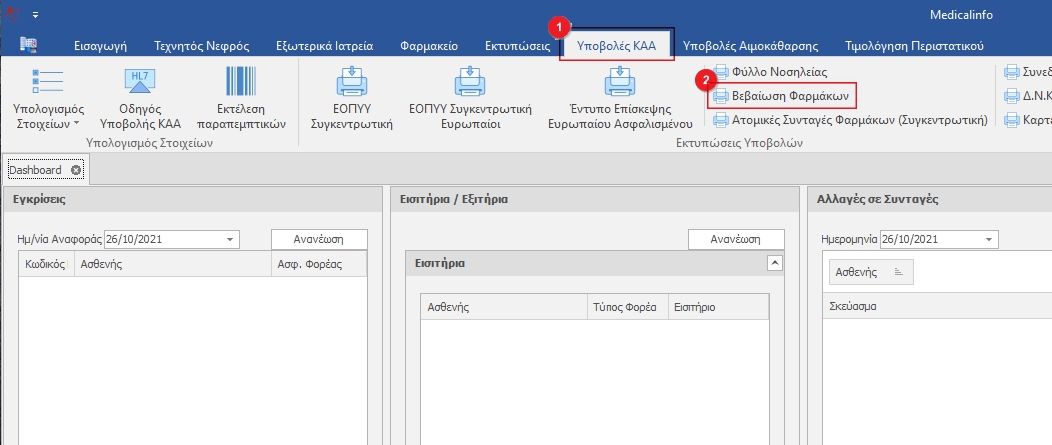 Στην καρτέλα Υποβολές ΚΑΑ (1) κλικάρουμε το κουμπί ΒεΒαίωση Φαρμάκων(2).