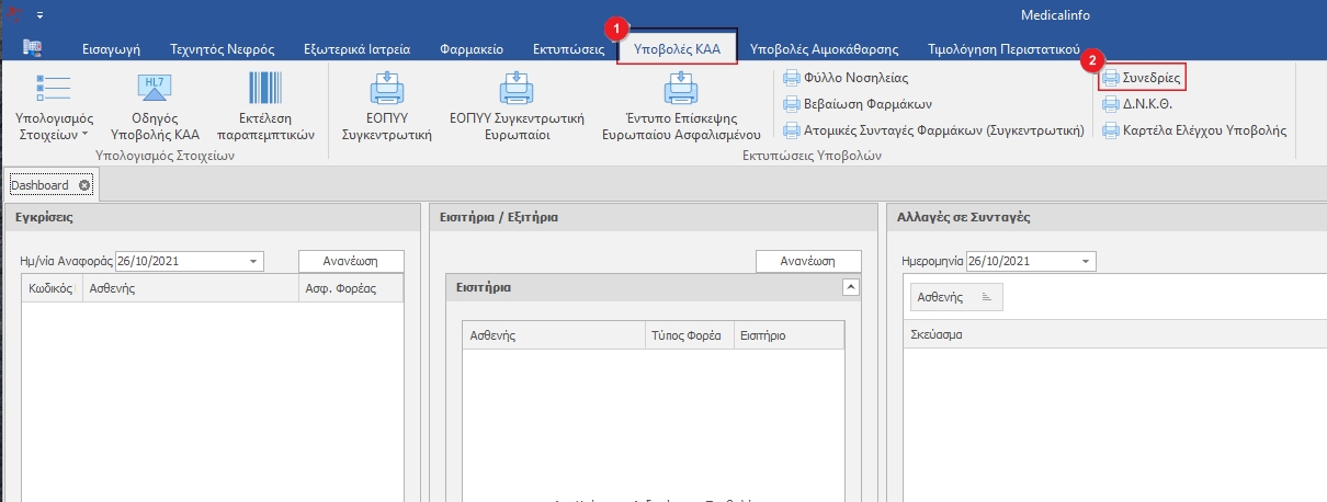 Στην καρτέλα Υποβολές ΚΑΑ (1) κλικάρουμε το κουμπί Συνεδρίες(2).