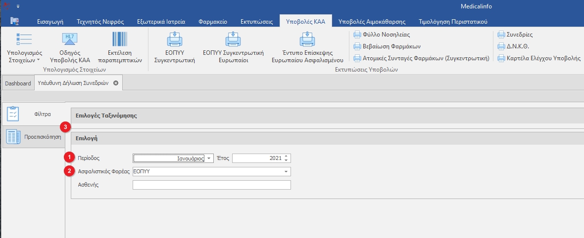 Επιλέγουμε την Περίοδο(1) και το Φορέα(2) που μας ενδιαφέρει και κλικάρουμε την καρτέλα Προεπισκόπηση(3).