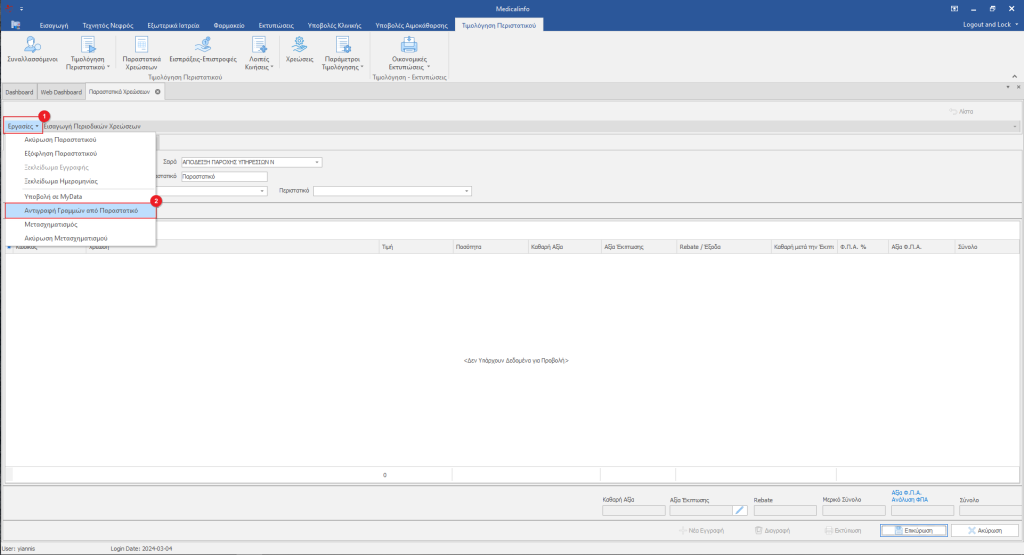 Για να αντιγράψουμε ένα παραστατικό χρέωσης κάνουμε κλικ στο κουμπί Εργασίες(1) εντός του νέου παραστατικού και από το Drop-down menu επιλέγουμε Αντιγραφή Γραμμών από Παραστατικό(2).