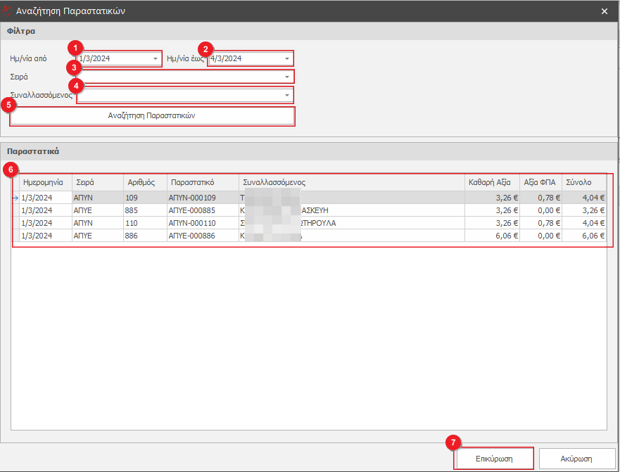 Στο αναδυόμενο παράθυρο αναζήτησης παραστατικού επιλέγουμε διάστημα Ημ/νία από(1) και έως Ημ/νία έως(2), Σειρά(3) ή/και Συναλλασσόμενο(4). Κάνουμε κλικ στο κουμπί Αναζήτηση Παραστατικών(5) για να εμφανιστούν στη λίστα(6) τα παραστατικά που πληρούν τα φίλτρα που συμπληρώσαμε. Επιλέγουμε το παραστατικό που θέλουμε να αντιγράψουμε και κάνουμε κλικ Επικύρωση(7).