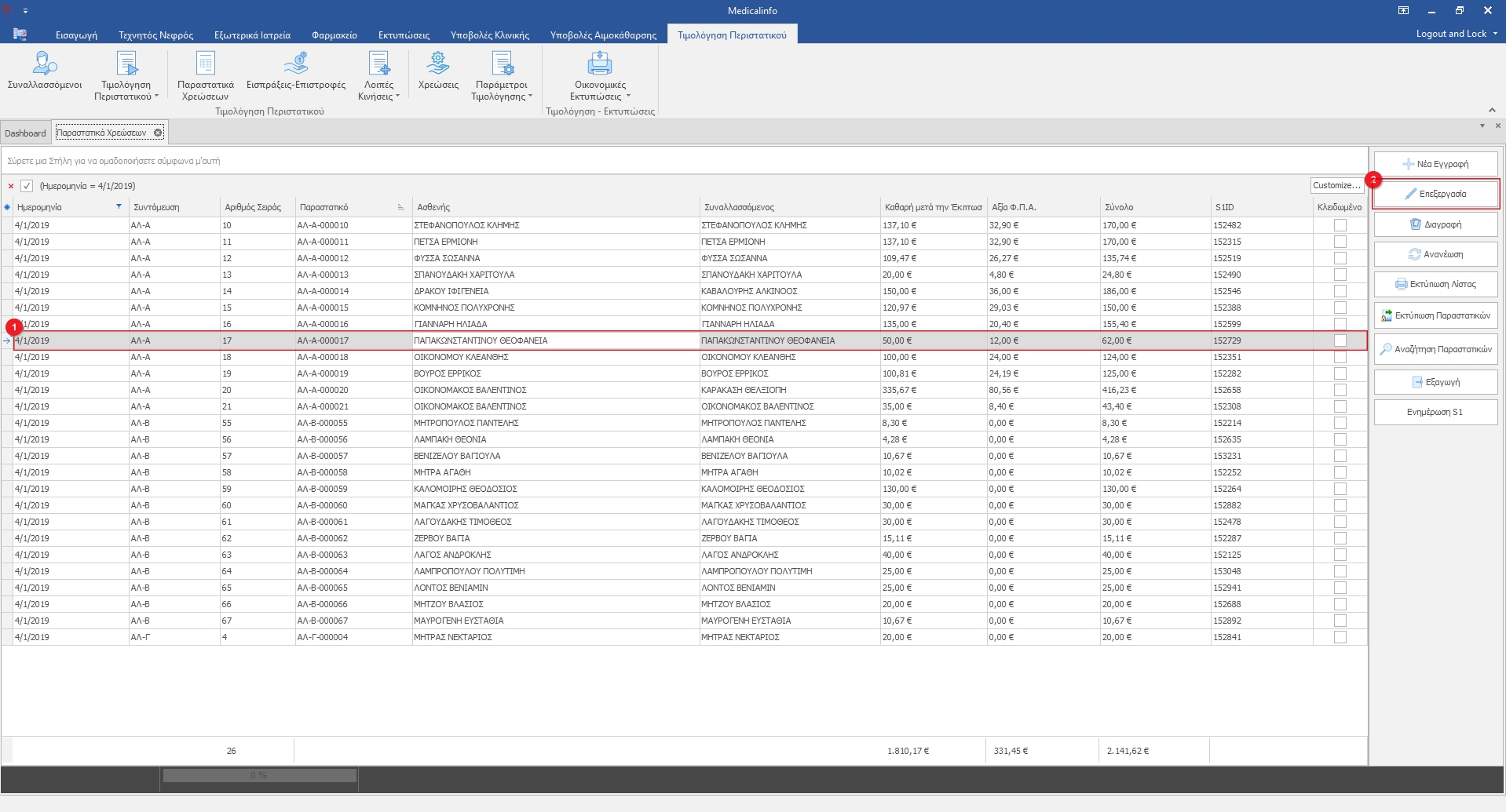 Για να ανοίξουμε το παραστατικό(1), το επιλέγουμε από τη λίστα και κάνουμε διπλό κλικ ή κάνουμε κλικ στο κουμπί Επεξεργασία(2).