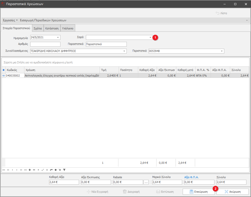 Στο αναδυόμενο παράθυρο-Παραστατικά Χρεώσεων συμπληρώνουμε τα στοιχεία του παραστατικού. Στο πεδίο Σειρά(1) επιλέγουμε την σειρά του παραστατικού και τέλος κάνουμε κλικ στο κουμπί Επικύρωση(2) για να δημιουργήσουμε το παραστατικό χρέωσης.