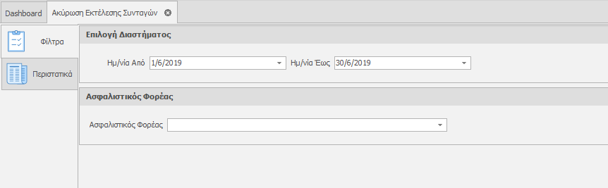 Η Ακύρωση Εκτέλεσης συνταγών, σαν διαδικασία, είναι ακριβώς η ίδια σαν την Εκτέλεση. Επιλέγουμε δηλαδή διάστημα, μέσα στο οποίο υπάρχουν εκτελεσμένες συνταγές-δελτία ανάλωσης.
