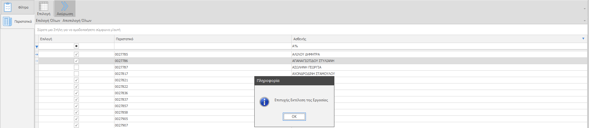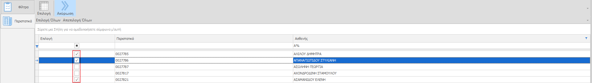 Από τη λίστα επιλέγουμε τα περιστατικά των ασθενών, για τα οποία θέλουμε να ακυρώσουμε τις εκτελεσμένες συνταγές και πιέζουμε >>Ακύρωση.