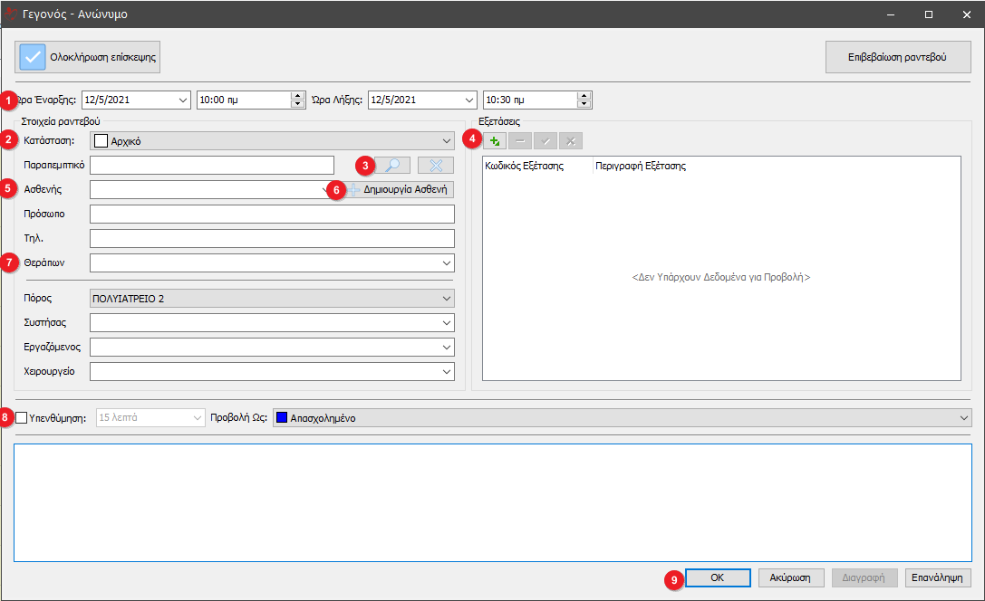 - Εμφανίζεται η Κατάσταση της επίσκεψης(Αρχικό, Επιβεβαιωμένο ή Ολοκληρωμένο).