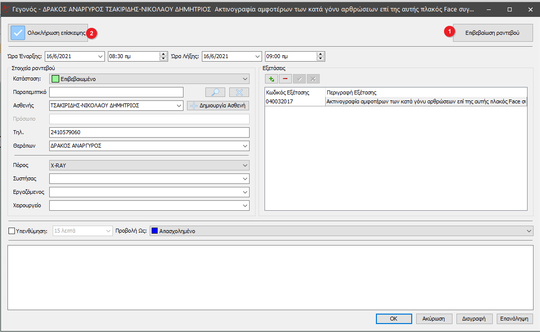 Αν η επισκεψη επιβεβαιωθεί κάνουμε κλικ στο κουμπί Επιβεβαίωση ραντεβού(1). Η Κατάσταση θα αλλάξει από Αρχικό σε Επιβεβαιωμένο. Τέλος για ολοκλήρωση της επίσκεψης κάνουμε κλικ στο κουμπί Ολοκλήρωση επίσκεψης(2). Με την Ολοκλήρωση της επίσκεψης δημιουργούμε νέο περιστατικό στα Εξωτερικά Ιατρεία με τα στοιχεία που έχουμε καταχωρήσει στην επισκεψη.