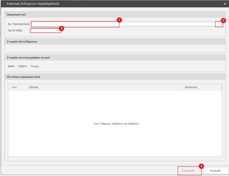 Στο παράθυρο αναζήτησης παραπεμπτικού πληκτρολογούμε τον αριθμό του παραπεμπτικού στο πεδίο(1) και κάνουμε κλικ στο κουμπί με το σύμβολο "..."(2). Ενημερώνονται όλα τα στοιχεία του παραπεμτικού και αν επιθυμούμε συμπληρώνουμε την Ημερομηνία Λήξης(3) του παραπεμπτικού. Τέλος κάνουμε κλικ το κουμπί Επικύρωση(4).