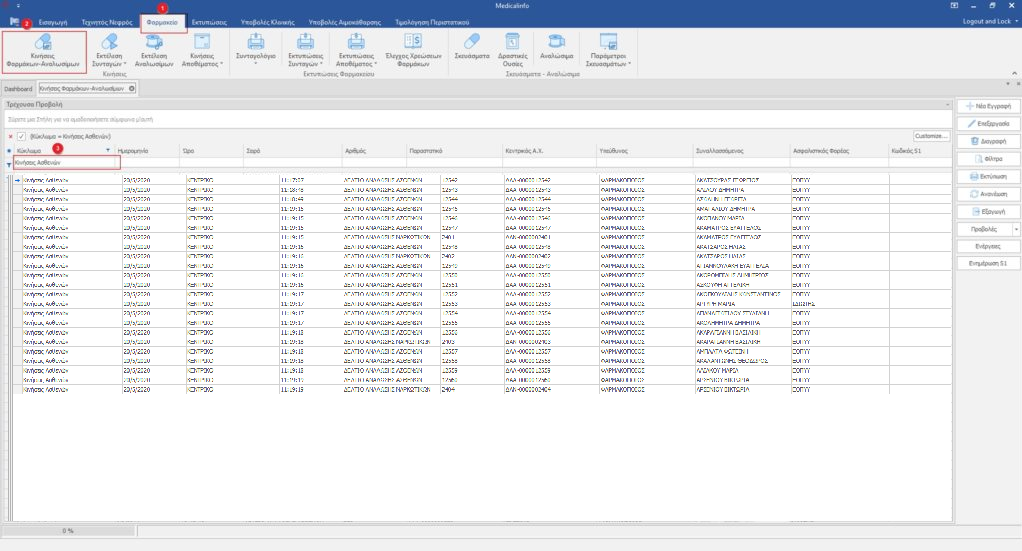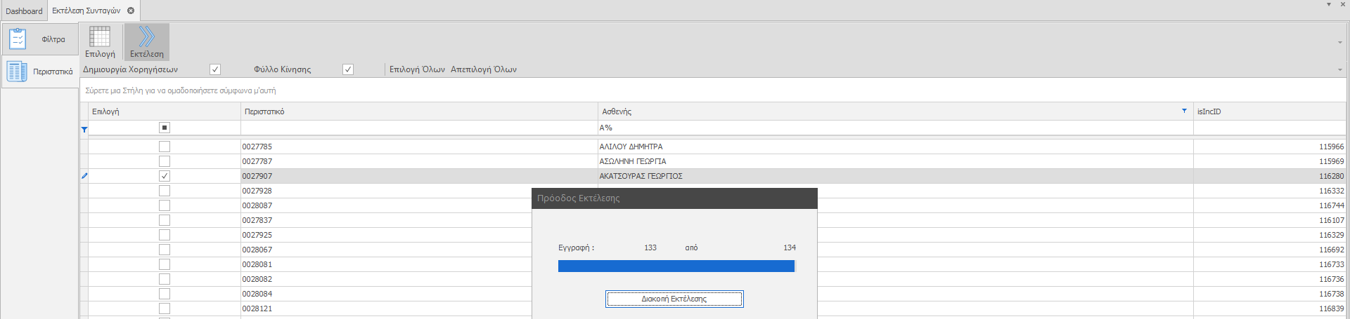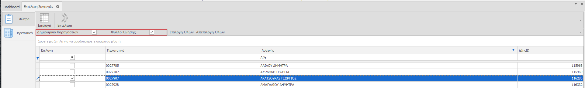 Επιλέγουμε τα περιστατικά των ασθενών, των οποίων τις συνταγές θέλουμε να εκτελέσουμε.