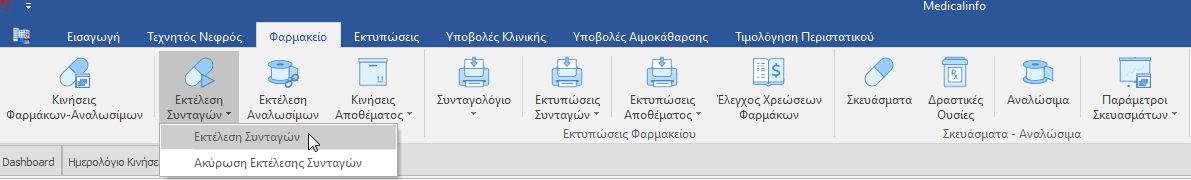 Εκτέλεση συνταγών πραγματοποιούμαι όταν θέλουμε να οριστικοποιήσουμε/εμφανίσουμε τις χορηγήσεις των σκευασμάτων των συνταγών στις καρτέλες των ασθενών. Για να ξεκινήσουμε τη διαδικασία κλικάρουμε από την καρτέλα Φαρμακείο το κουμπί Εκτέλεση Συνταγών και απο το drop down μενού Εκτέλεση Συνταγών.