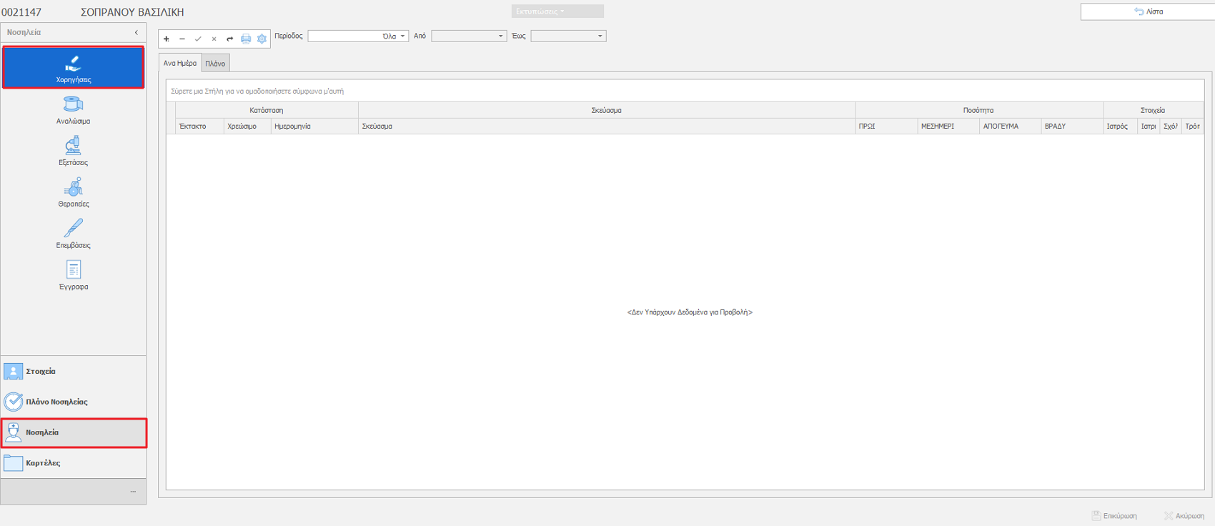 Κάνουμε κλικ στην καρτέλα Νοσηλεία και στη συνέχεια στην καρτέλα Χορηγήσεις.