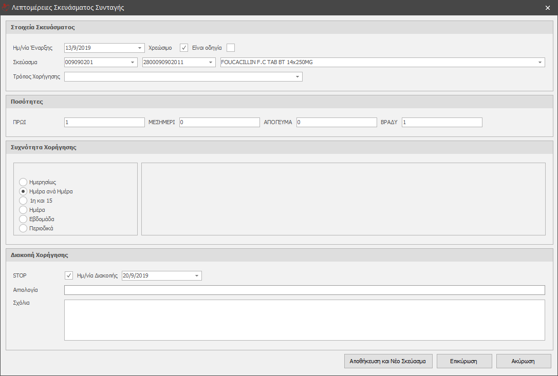 Για την ορθή χρήση της φαρμακευτικής αγωγής στις πραγματικές συνθήκες εργασίας κάθε σκεύασμα/φάρμακο διαθέτει μία σειρά από λεπτομέρειες όπου ο χρήστης έχει στη διάθεση του. Η συγκεκριμένη φόρμα ανοίγει είτε με την εισαγωγή νέου φαρμάκου είτε με την επεξεργασία υπάρχων.