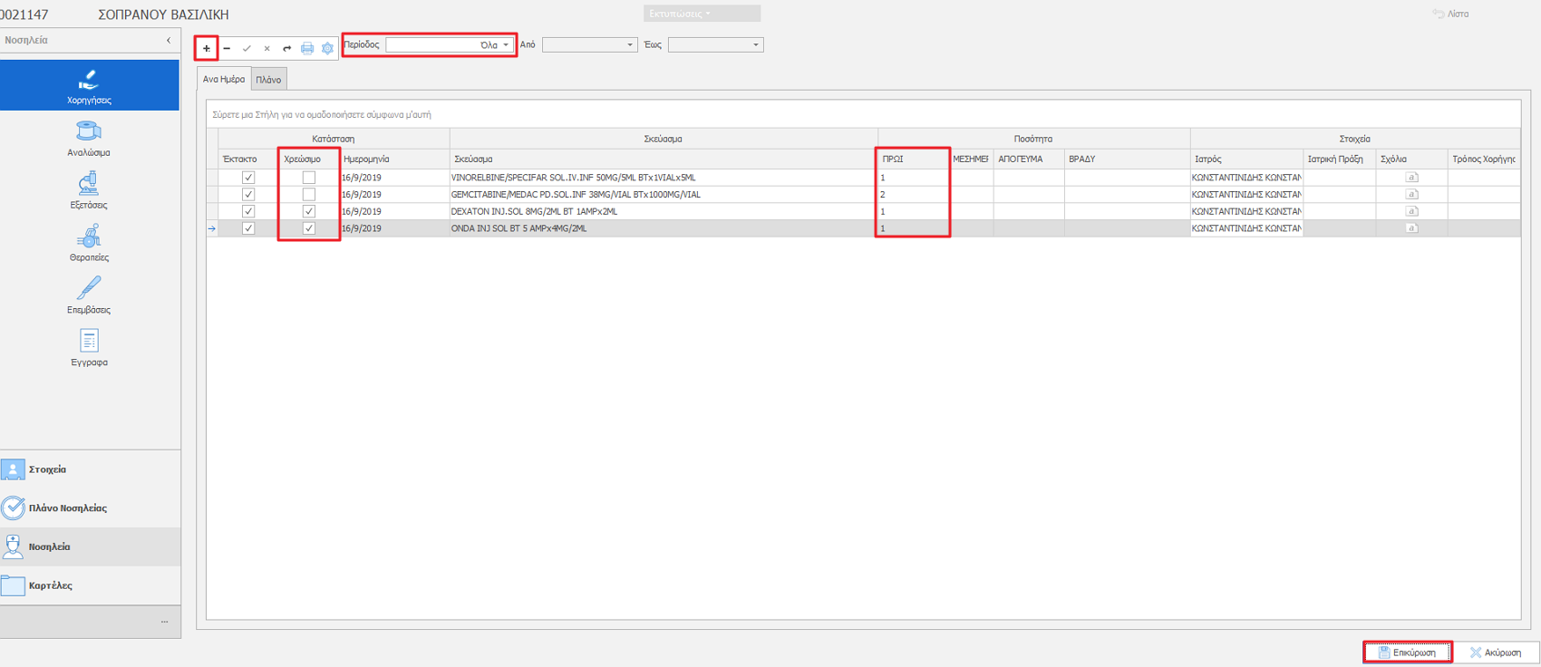 Ακύρωση: Ακύρωση των καταχωρήσεων και κλείσιμο φόρμας (επιστροφή στη λίστα της φαρμακευτικής αγωγής).