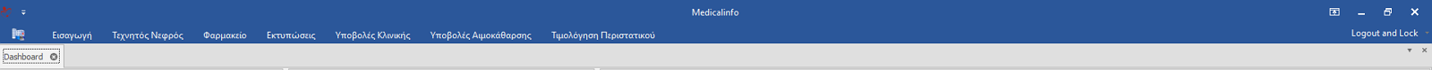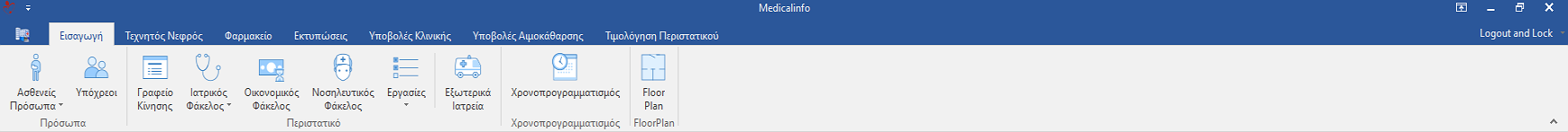 Το Medicalinfo χρησιμοποιεί το σύστημα μενού ribon που συναντάται στις εφαρμογές του Microsoft Office και στο επάνω μέρος (μπλε περιοχή) βρίσκεται το μενού πρώτου επιπέδου ενώ ακριβώς από κάτω στην ανοιχτόχρωμη περιοχή οι επιλογές δευτέρου επιπέδου (περιεχόμενα μενού πρώτου επιπέδου).