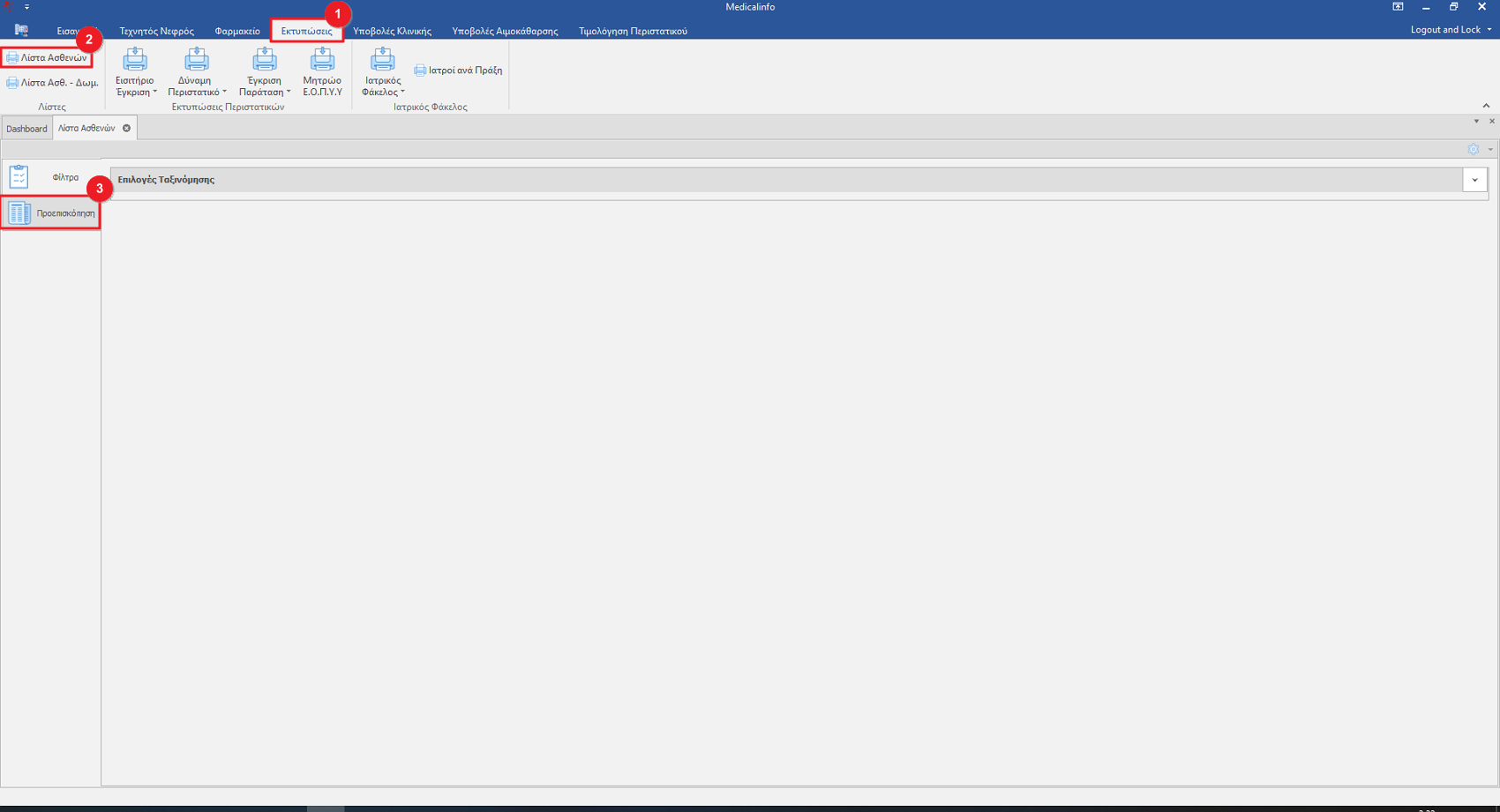 Για να εμφανίσουμε την Λίστα Ασθενών από το Μενού Εκτυπώσεις(1) επιλέγουμε Λίστα ασθενών(2). Στα αριστερά του κυρίως παραθύρου κάνουμε κλικ στην καρτέλα Προεπισκόπηση(3).