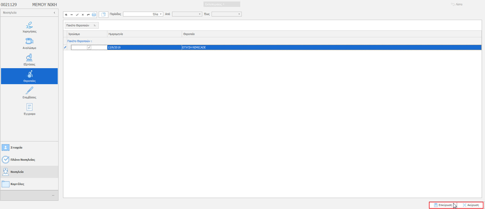 Ο μηχανισμός των θεραπειών βρίσκεται στον Ιατρικό φάκελο – επιλογή ασθενή και συγκεκριμένα στην καρτέλα Νοσηλεία.