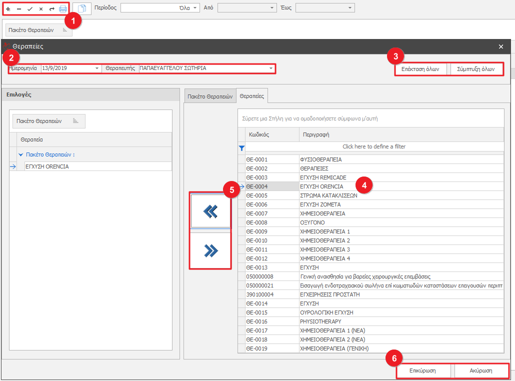 - Στα δεξιά εμφανίζονται οι διαθέσιμες Θεραπείες/πακέτα θεραπειών.