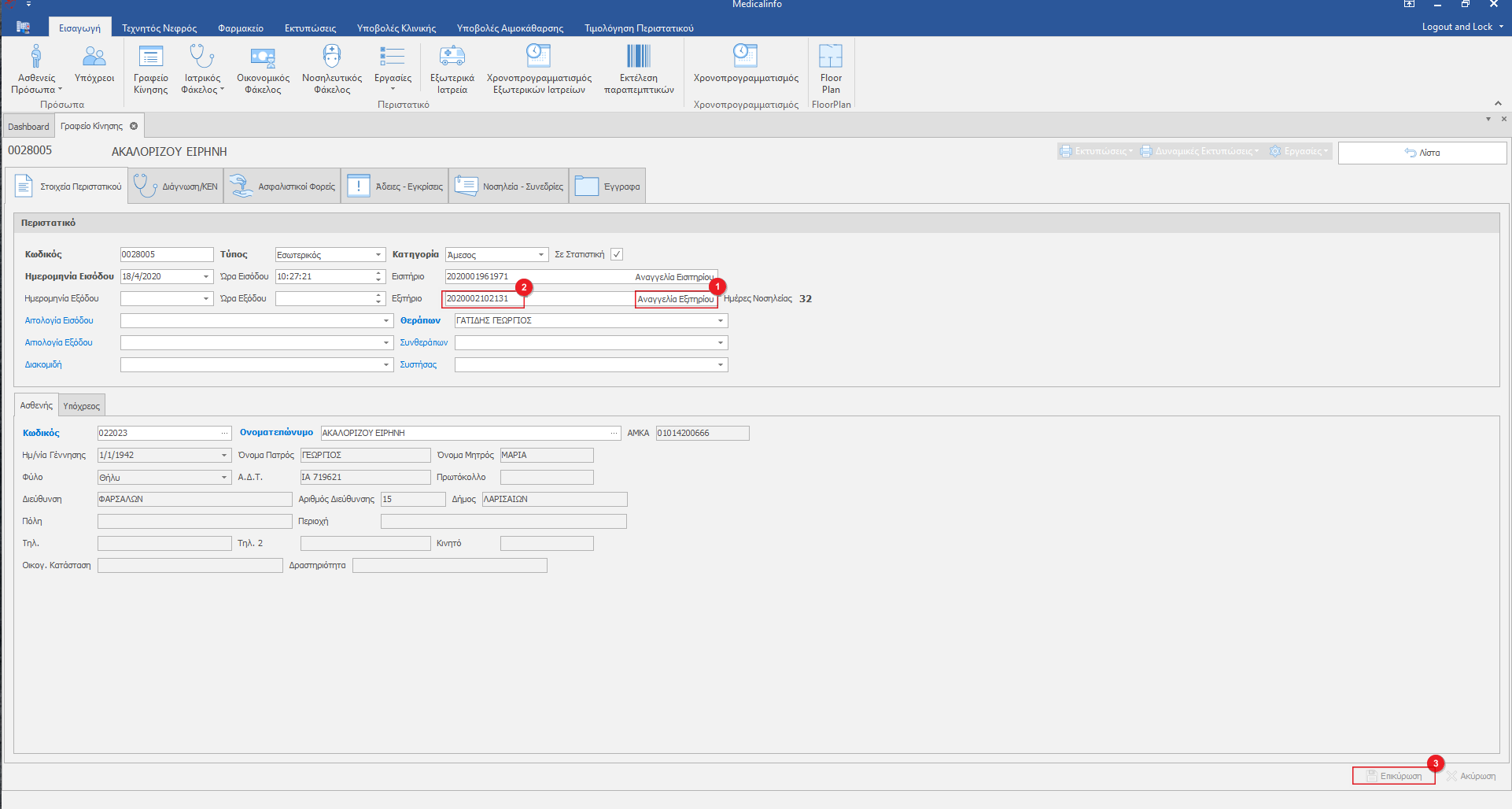 Κάνοντας κλικ στο κουμπί Αναγγελία Εξιτηρίου(1)  ξεκινάει η διαδικασία αναγγελίας και εμφανίζεται ο αριθμός εξιτηρίου(2), ο οποίος δεν μπορεί να μεταβληθεί από τον χρήστη, τέλος Επικυρώνουμε(3).
