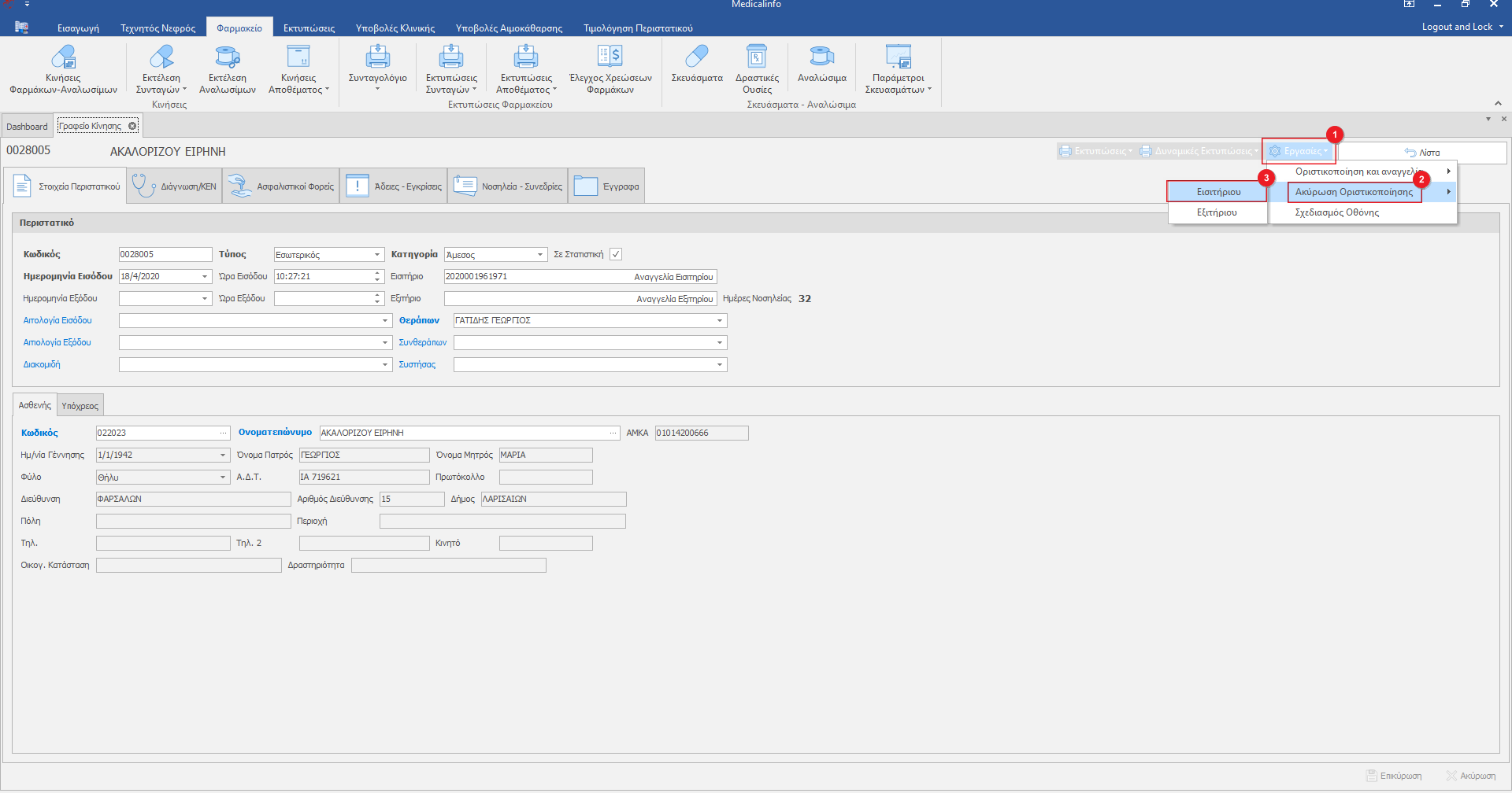 Κλικάρουμε το κουμπί Εργασίες(1) ,από το drop down μενού επιλέγουμε Ακύρωση Οριστικοποίησης(2) και επιλέγουμε για ακυρωση Εισιτηρίου(3), ενώ για εξιτήριο Εξιτηρίου.  Ακολουθώντας την παραπάνω διαδικασία ακυρώνεται η αναγγελία εισιτηρίου/εξιτηρίου και πλέον μπορεί ο χρήστης να κάνει τις διορθωτικές ενέργειες.