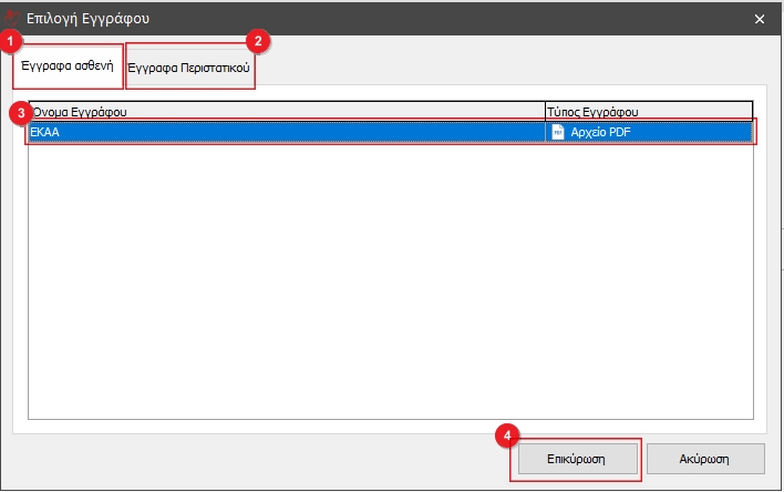 Αν έχουμε αποθηκεύσει την ΕΚΑΑ ή το Π.Π.Α στα έγγραφα του Ασθενή επιλέγουμε Έγγραφα ασθενή(1), αν το αποθηκεύσαμε στα έγγραφα του περιστατικού επιλέγουμε Έγγραφα Περιστατικού(2). Στη συνέχεια επιλέγουμε το έγγραφο(3) και τέλος κάνουμε κλικ στο κουμπί Επικύρωση(4).
